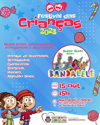 No próximo domingo, dia 15 de outubro, às 15h, a festa acontecerá na Rua José Cadete (ao lado da Sede da Assistência Social). E temos um convite especial para todos: venham participar do "Festival das Crianças",